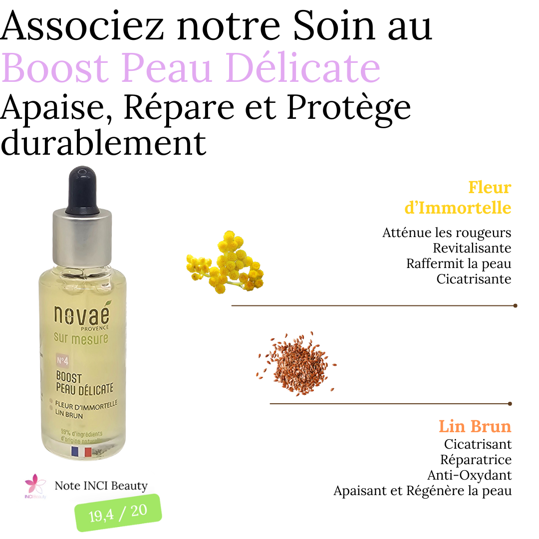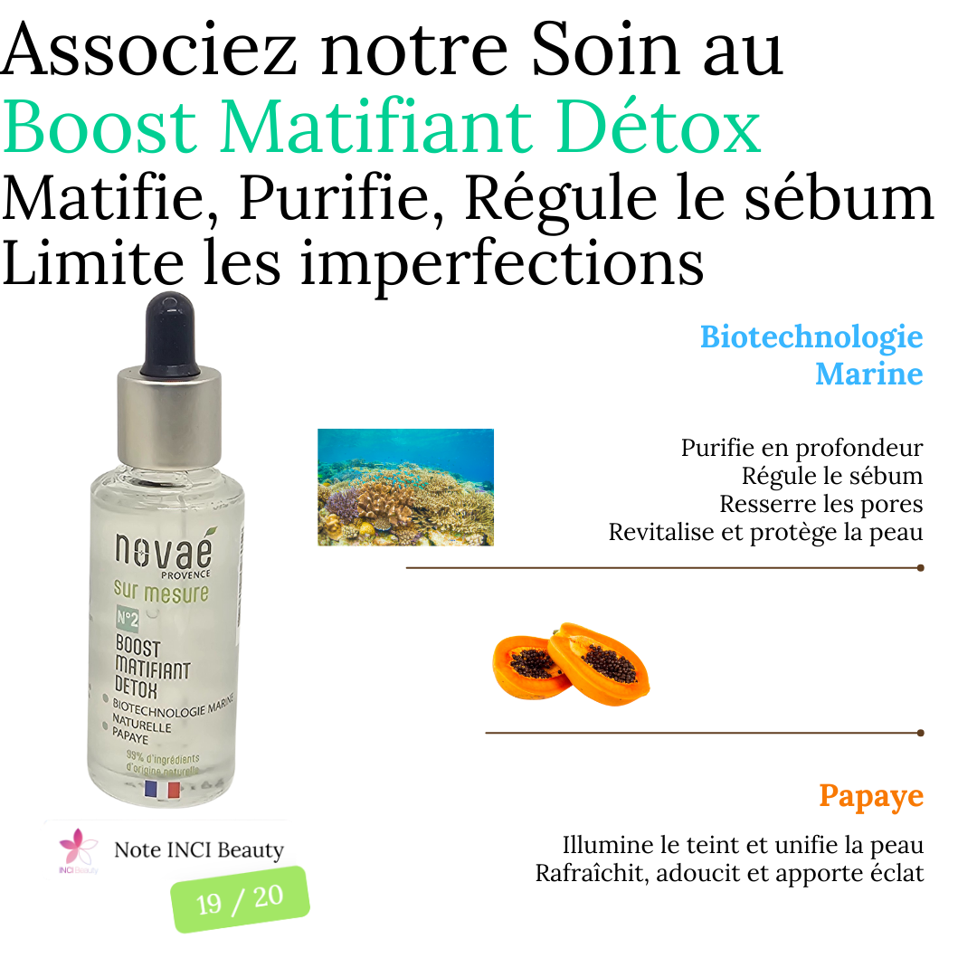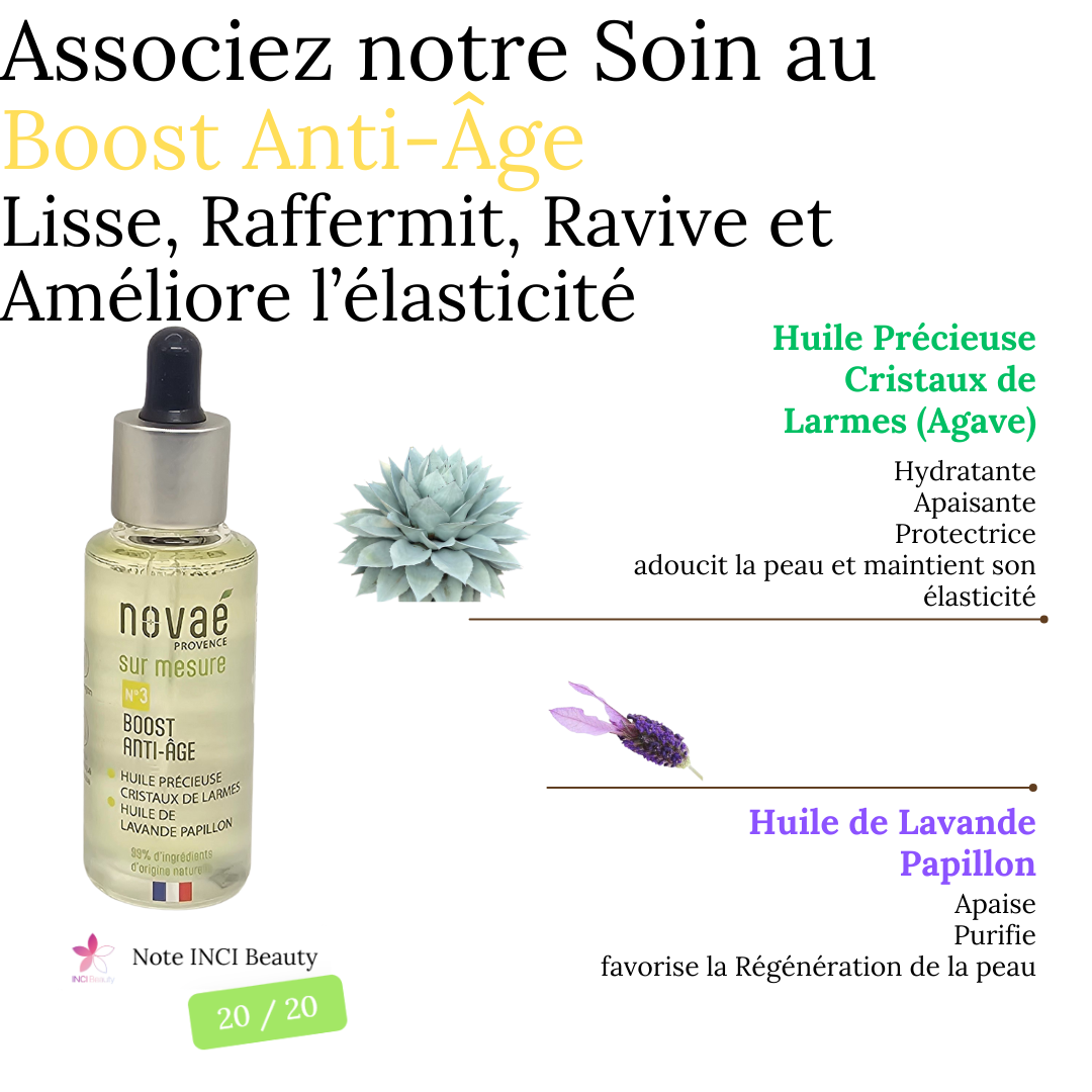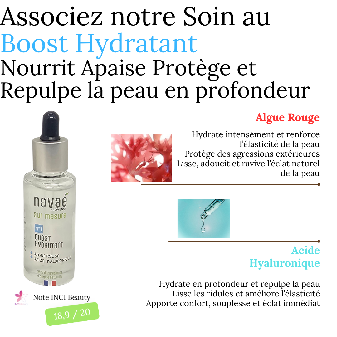 * Un soin visage hydratant et anti-âge, universel, adapté à toutes les peaux, déjà efficace seul et que l’on personnalise grâce à un ou plusieurs boosts d’actifs naturels concentrés, pour cibler précisément l’action recherchée : anti-âge, hydratation, matité/détox ou apaisement.