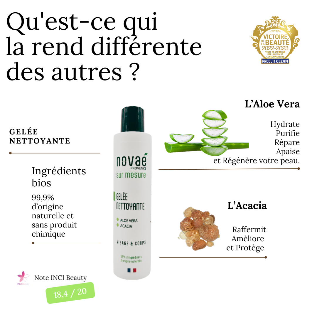 * Une gelée nettoyante naturelle à l’aloe vera et à l’acacia, pour un nettoyage doux et efficace.