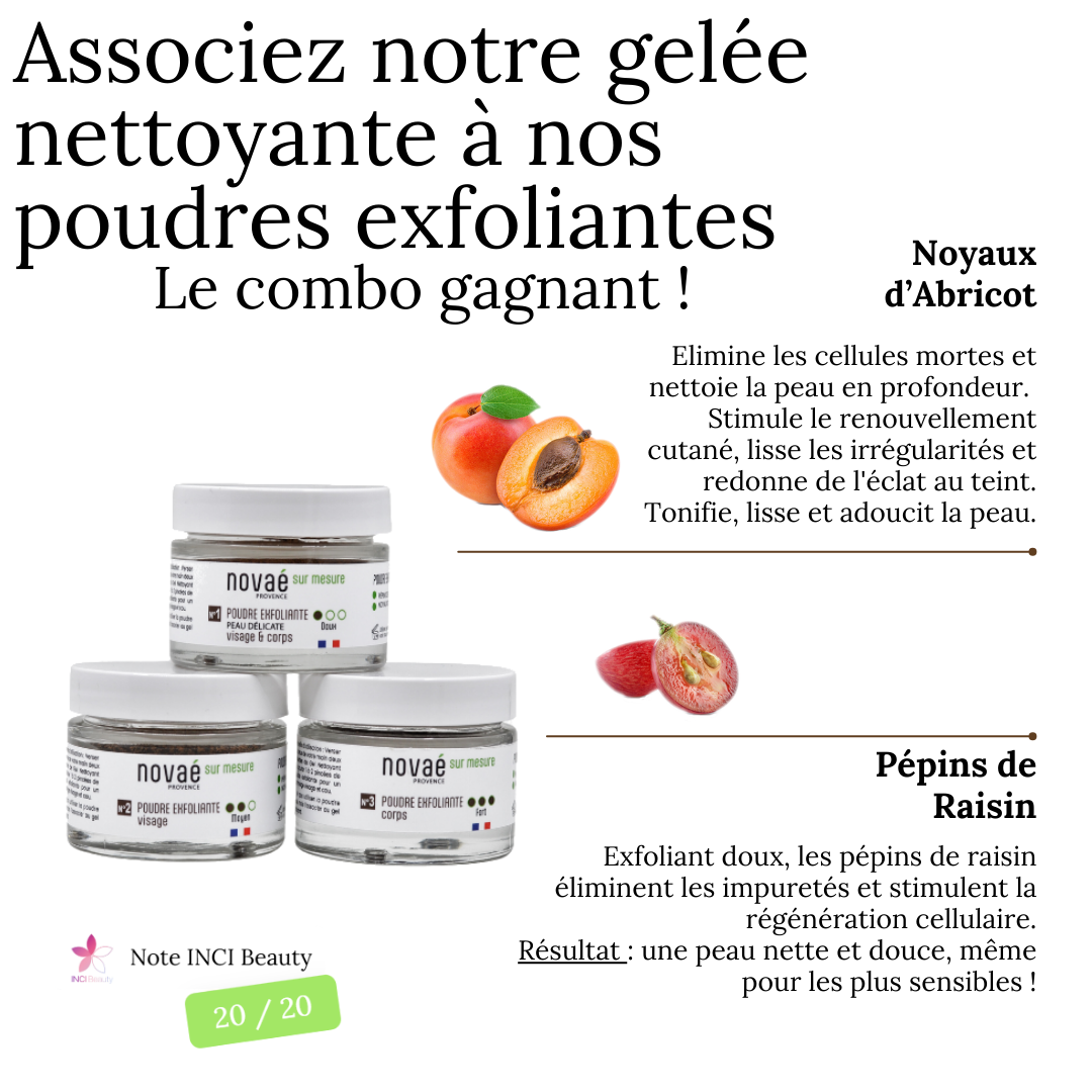 À mélanger avec la gelée nettoyante et à utiliser 1 à 2 fois par semaine, selon la tolérance et les résultats observés.